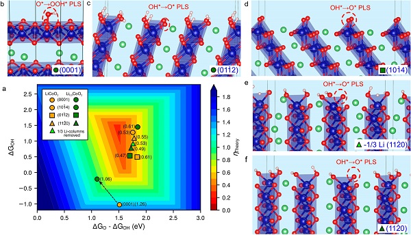 a: 通过理论计算得出的LiCoO2/Li0.5CoO2体系析氧反应活性分布图。每一个橙色(绿色)图标对应一个LiCoO2/Li0.5CoO2表面,其后的数字为理论计算的析氧反应过电位值。