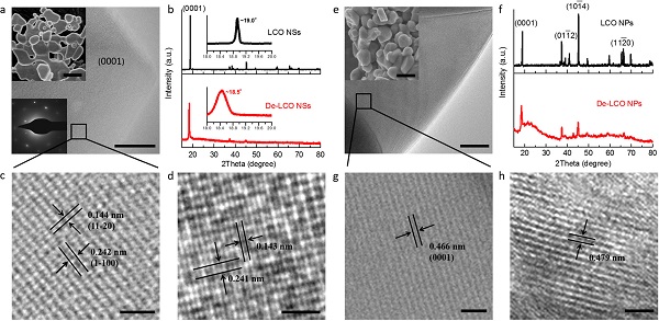 c-d: LCO纳米片在电化学脱嵌之前和之后的高分辨率TEM图像,比例尺为1nm。这两张图表明优先暴露的(0001)晶面未受脱嵌过程影响。