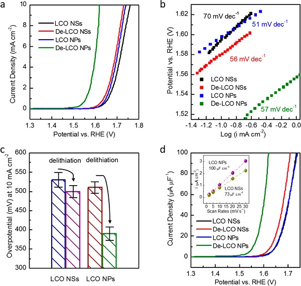 a: 未经电化学脱嵌的经过电化学脱嵌的LCO纳米片和LCO纳米颗粒的极化曲线。根据表征结果,电化学脱嵌对LCO纳米颗粒的析氧反应活性有显著提升作用,但是对LCO纳米片却几乎无影响。这表明基底平面对析氧反应基本不具有活性,但是其它主要与之相反。