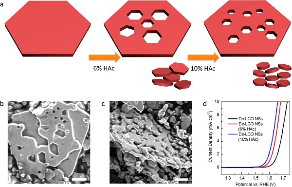 d: 原De-LCO纳米片和6%和10%浓度条件下刻蚀的LCO纳米片的析氧反应极化曲线,刻蚀过程对于反应活性的提高表明新生成的表面具有高的反应活性。