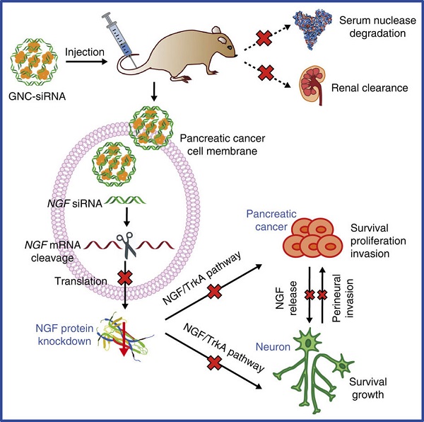 胰腺癌是最致命的癌症之一,5年生存率<5%,化疗药物结合多模式治疗方案仅可以将患者的存活数的中位数在一个月内由5.0增加到7.2。 因此,迫切需要新的治疗方法来治疗这种致死性疾病。 胰腺癌恶化高度依赖于神经微环境,因此抑制神经生长因子(NGF)的基因表达可能在胰腺癌治疗中发挥很大的作用。