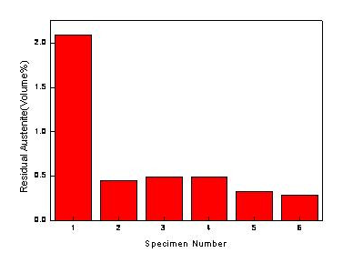 钢材样品中含有少量残余奥氏体,经拉伸断裂后测量奥氏体向马氏体转变的情况,样品中含有奥氏体和马氏体两相。拉伸前样品中残留的奥氏体约为2%(V),经拉伸试验后,试样中只留有0.2%~0.5%的奥氏体。按常规扫描速度(8°/min),扫描出来的图谱中不能发现奥氏体峰的存在。后改用步进扫描:步长0.02°,计数时间1.5s。结果相当好。