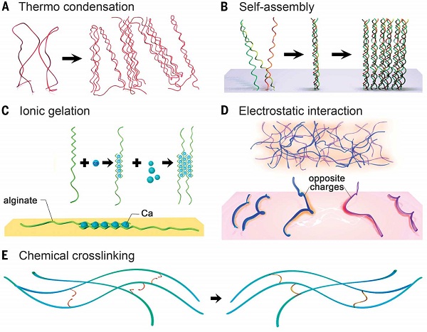分散在水溶液介质中的聚合物链通过多种机理发生交联后,形成水凝胶。这些机理包括:物理纠缠、离子反应、化学交联等,具体的机理由聚合物的内在特性决定。