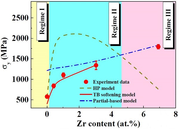 图中是基于不同强化模型的屈服强度计算值与实验值(σy=H/3)的对比。短划线、实线和点划线分别代表Hall-Petch(H-P)模型、孪晶(TB)软化模型和局部模型;图中的点是实验值。根据主导强化模型的不同,图中分成了3个区域,H-P区(I区)、孪晶软化区(II区)和局部模型区(III区),分别对应纯Cu、Cu-Zr(Zr≤3.0 at.%)和Cu-Zr(Zr=7.0 at.%)的微观结构。