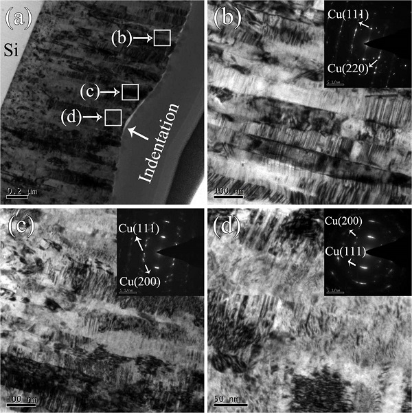 (a)压痕处Cu-1.0 at.% Zr薄膜的TEM图。图中标注为(b)、(c)和(d)的方块区域分别代表未变形区、轻微变形区和严重变形区;