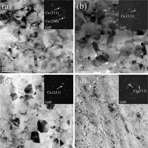 (a)纯Cu;(b)Cu-1.0 at.% Zr;(c)Cu-3.0 at.% Zr;(d)Cu-7.0 at.% Zr。右上角插图为相应的衍射花样。