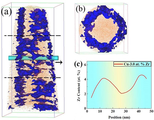 (a)Cu-3.0 at.% Zr合金化薄膜的APT重构。图中蓝色的Zr元素成分等值面对应其名义浓度>4 at.%。橙色代表Cu原子。分析区域的尺寸为50nm×50nm×110nm;