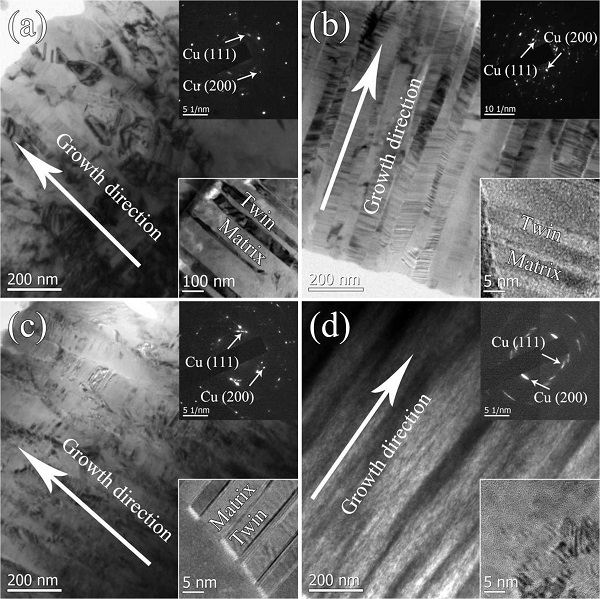 图6:纯Cu及合金化Cu-Zr薄膜的断面TEM图