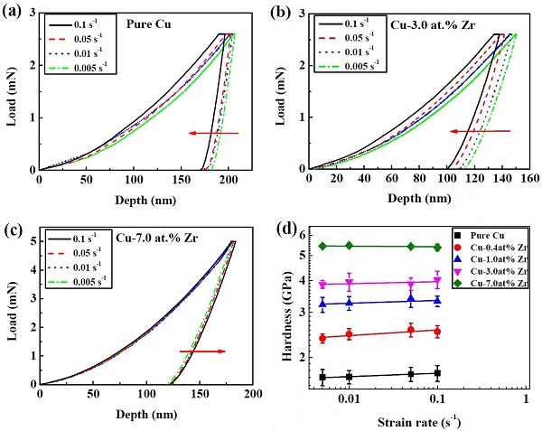 (a-c)分别为纯Cu、Cu-3.0 at.% Zr和Cu-7.0 at.% Zr薄膜的载荷-深度曲线。图中箭头方向表示应变速率逐渐增大;