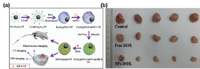 (a) 基于Fe3O4@PAA/AuNCs/ZIF-8纳米复合材料的三种模式的癌症成像和化疗;