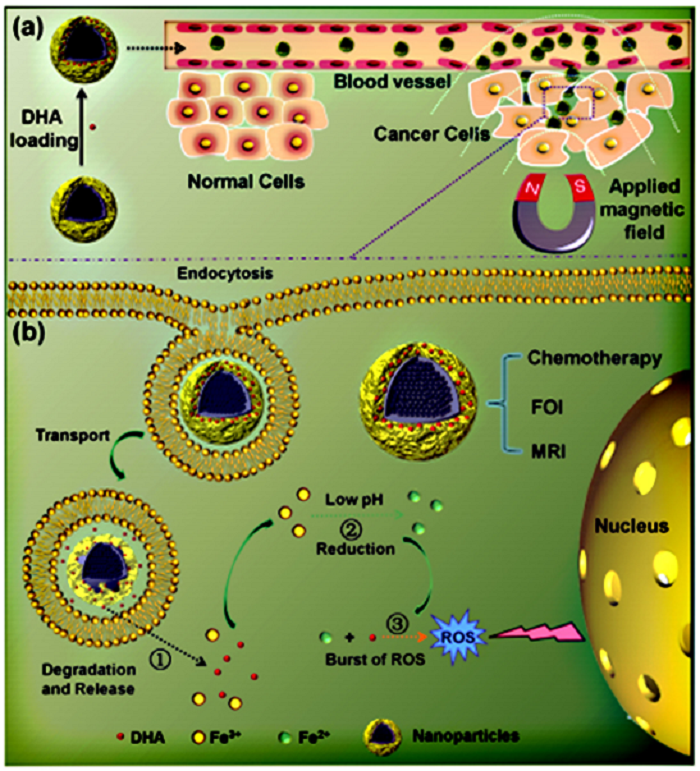 (a) 磁场介导载有二氢青蒿素(DHA)的Fe3O4@C@MIL-100(Fe) (FCM)进入癌细胞;