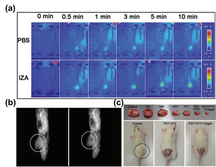 (a) 携带肿瘤的小鼠在注射5 mL的Fe3O4/ZIF-8 Au25后用808 nm的近红外光(0.5 Wcm-2)照射的近红外热成像,研究了808 nm的近红外光(0.5 Wcm-2)光照时间的影响;