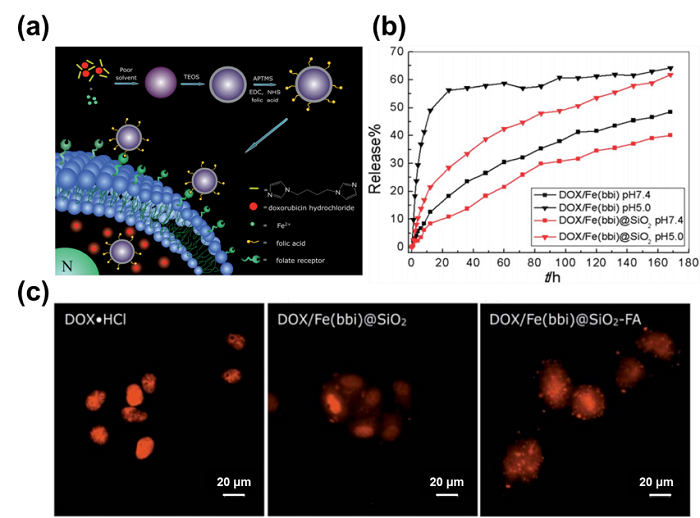 (a) 通过在1,1′(1,4-丁二基)二(咪唑) (bbi)溶液中加入阿霉素(DOX),将DOX原位封装在Fe(bbi) MOF中,制备DOX/Fe(bbi)@SiO2-FA示意图;