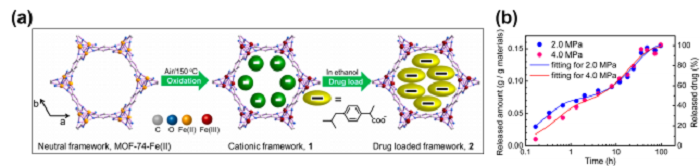 (a) MOF-74-Fe(II)氧化制备阳离子型的MOF-74-Fe(III)的过程和载药示意图;