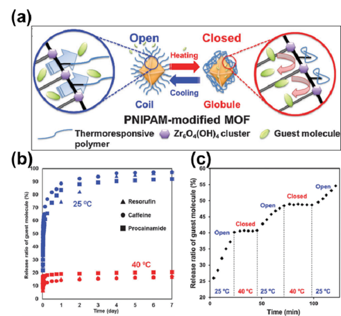 (a) UiO-66-PNIPAM的可控药物释放示意图,聚(N-异丙基丙烯酰胺)(PNIPAM)是一种温敏材料,低于32℃时表现出亲水性;