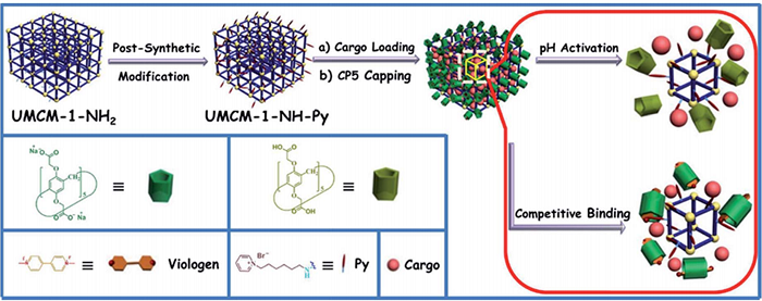 柱芳烃“阀门”修饰的UMCM-1-NH2 NMOF实现双刺激响应型药物传递系统(DDS)的示意图,图中为pH响应型和竞争结合剂刺激响应型材料实现的药物传递。