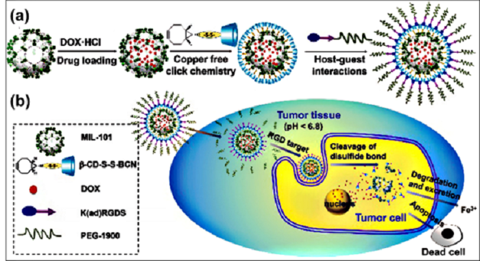 (b) 基于MIL-101 MOF体系的癌症治疗过程,该药物传递方式能够提高药物传递效率和癌症治疗效果。