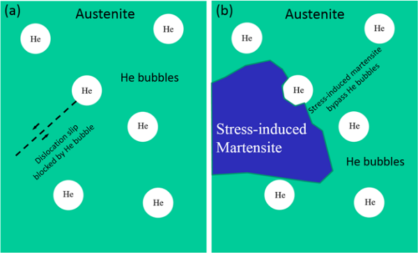 (b)应力诱发马氏体能够绕过纳米级的氦泡,因为它们的成核尺寸大于氦泡。