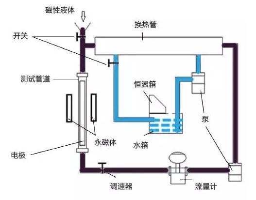 一般的发电方法都会产生大气污染以及热污染,对环境十分有害,而利用磁性液体来发电是一种新的发电模式,它具有效率高、环境污染小等优点。如下图所示,左侧有机玻璃管两边加有匀强磁场,用导线将两电极外侧与外接负载相连,磁性液体经测试管道流下,经过磁场时作为导电流体做切割磁感线运动,两电极之间将产生电势差,从而产生感应电流。磁性液体在流动过程中,经过流量计记录其流速,当液体流到底部时被水泵抽到上面,再通过换热管调节流体的温度。整个循环系统通过恒温器和换热管调节温度,与换热管相连的恒温器用来控制恒温器下水槽内水的温度,水槽中的水和换热管外筒里的水进行不断循环,保证经过换热管内筒的磁性液体的温度和恒温器的温度一样。
