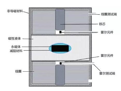 下面介绍一下振动发电装置的结构设计原理,通常是在非导磁性耐冲击材料构成的容器中,装有高浓度、高稳定性、低黏度(矿物油基)的磁性液体,利用磁性液体的二阶浮力原理,液体中央悬浮永磁体,永磁体被特定的减阻材料包覆。容器外壁放置维度线圈,线圈引线端与负载及指示灯连接成回路。该装置接受外界的振动时会引起永磁体与外围线圈的相对运动,使线圈回路的磁通量发生变化,从而产生感应电动势,形成感应电流,此为一个单元的发电,若将多组发电单元连接,即可实现阵列化发电。线圈引线端口固定于容器外壁,该端口可检测线圈的发电状态。线圈内部添加铁芯,铁芯底端有霍尔元件,霍尔元件引线端口固定在容器外壁,该端口可检测磁变化。