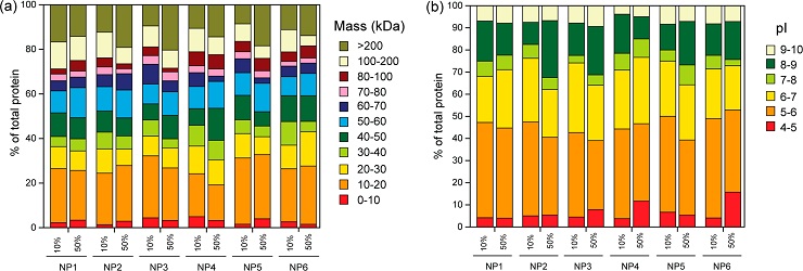 在10%和50%的血清中,富集了所有分子量的冠状蛋白质。相比PI<7被吸附蛋白的主要结构与在pH值为7.4时10%和50%血清中的NP6,表明NP1-NP6与血清蛋白的结合方式主要是静电相互作用。