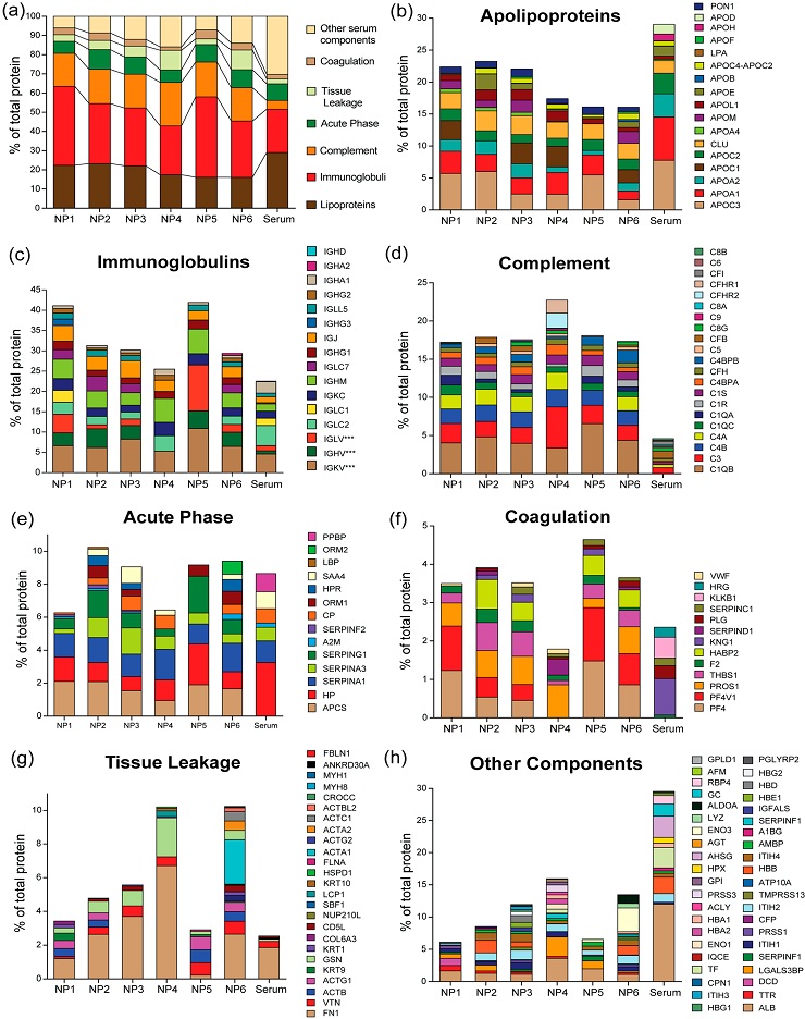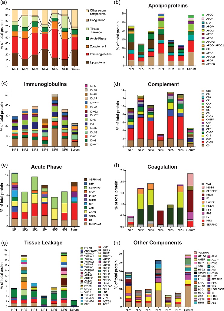 为了更好地理解具体的化学基团在冠状蛋白起到的作用以及后续对血液中纳米颗粒的影响。根据它们在血液中的功能(即激活补体、免疫反应、凝血分类鉴定的蛋白、急性期反应和脂质代谢),进一步使用生物分析工具鉴定蛋白质并分类。在研究者的分析中,凡是培养在血清10%(图3)和血清50%环境中(图4)不论何种NP表面成分,发现组成冠状蛋白的主要蛋白质类型为免疫球蛋白和载脂蛋白(约占总蛋白的60%)。