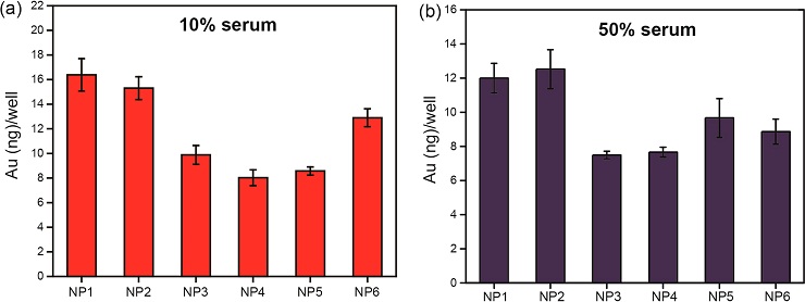 图5 3h后不同生理条件下在RAW细胞中的NP1−NP6的摄入量:(a)10%血清;(b)50%血清