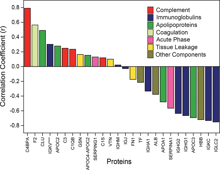 图6在50%生理血清条件下NP1−NP6中巨噬细胞摄入和冠状蛋白类型之间的关系(已选定的不同的类别的蛋白质,表现出较大的正相关或负相关)研究者进一步确定了相关的摄入方式和NP1−NP6的蛋白形成方式,促进巨噬细胞识别蛋白的形成。图6表示为在50%血清条件下在冠状发现某特定蛋白的皮尔森系数(r)。C4BPA和IGLC2显示与巨噬细胞摄取最高的正、负相关系数(r)。以C4BPA为基础组成的冠状蛋白质将会造成更多的纳米颗粒被巨噬细胞摄入,这也使得其有能力结合凋亡/坏死细胞,并为免疫清除系统识别它们。
