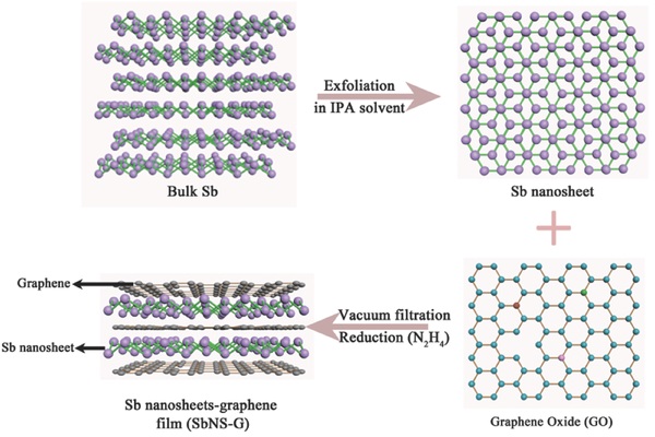 图中所示制备Sb纳米片的过程。把块状Sb金属粉末溶于异丙醇溶液中,通过液相剥离的方法得到超薄Sb纳米片。将石墨烯与所制备的纳米片相混合(比例4:1),通过抽滤和化学还原的方法得到均匀的Sb纳米片-石墨烯复合膜。