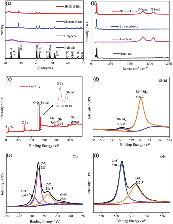 图4 Sb纳米片,Sb纳米片–石墨烯复合膜的XRD,拉曼以及XPS图
