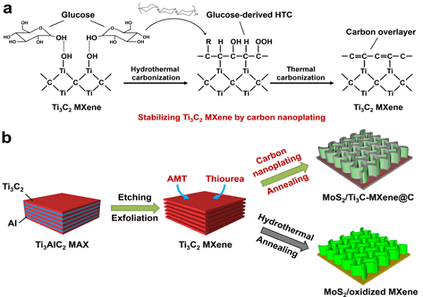 图1 (a)基于纳米涂覆有机物衍生碳提高MXene结构稳定性的策略;(b)基于MXene的高稳定性MoS2/Ti3C2-MXene@C纳米复合结构的可控构筑策略。