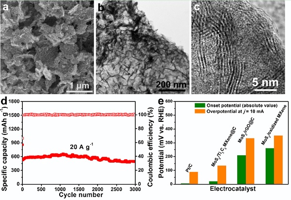 图2 MoS2/Ti3C2-MXene@C纳米复合结构的(a)扫描电子显微镜照片,(b)透射电子显微镜照片;(c)高分辨率透射电子显微镜照片;(d)作为锂离子电池负极材料的超长循环稳定性;(e)作为电化学析氢催化剂的优异性能。