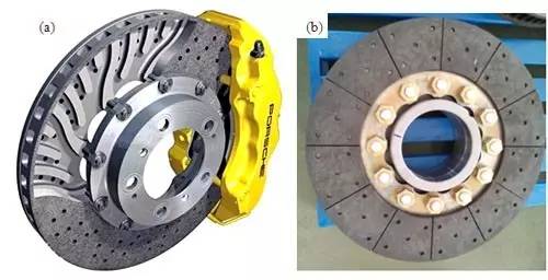 (a) SGL公司开发的保时捷用C/C-SiC制动盘; (b)中南大学开发的高速列车C/C-SiC制动盘