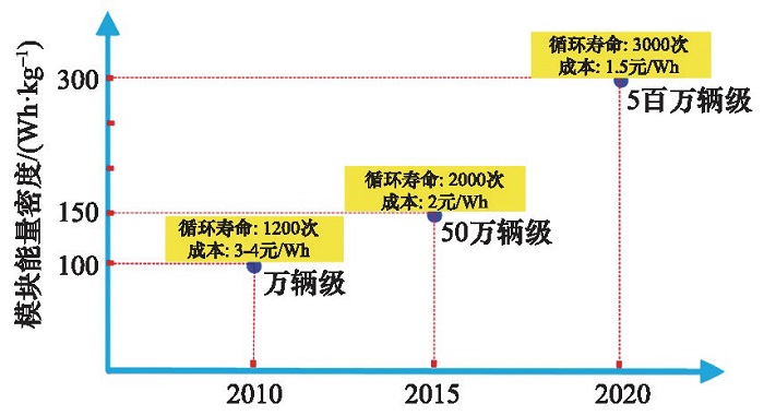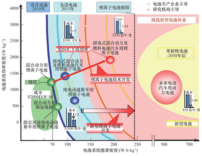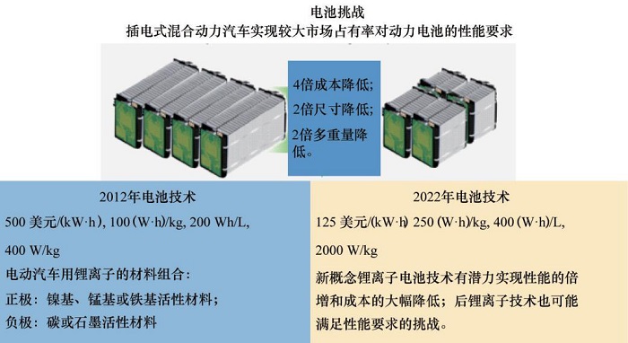 美国能源部所属的能源效率及可再生能源办公室发布了“电动汽车无处不在大挑战蓝图”(图3)。该蓝图重点支持应用于插电式混合动力汽车的锂离子电池技术研发。为实现蓝图目标,美国能源部所属的能源效率及可再生能源办公室、能源先进研究项目办公室和科学办公室分工合作,共同推动车用动力电池的技术进步。