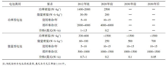 日本经济产业省在2011年的报告中提出了车用动力电池的功率密度、能量密度及成本的目标值(图4)。2013年日本经济产业省下属的新能源与工业技术开发组织发布了“二次电池技术路线图2013”,提出了电动汽车用及固定式用二次电池的技术指标(表2)。