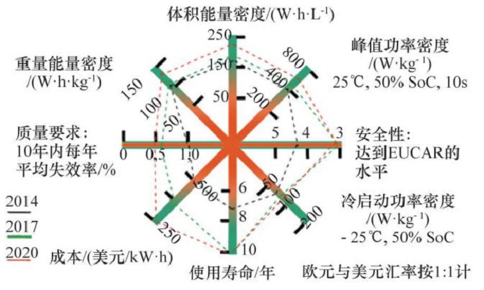 德国政府为推动电动汽车的发展,制定了国家电驱动平台计划,主要在材料开发及电池技术、创新性电池设计技术、安全性评估及测试流程、电池寿命的建模与分析、大规模生产的工艺技术等五方面开展研发工作,提出了动力电池系统主要性能参数(2014-2020)(图5)。