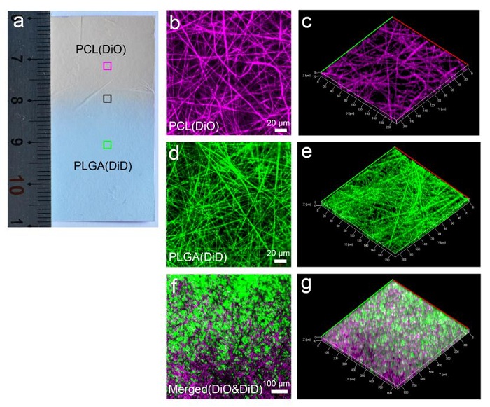 (b-g) 共聚焦显微镜下,共纺薄膜不同区域的PCL/PLGA纤维形态、分布及三维重构。
