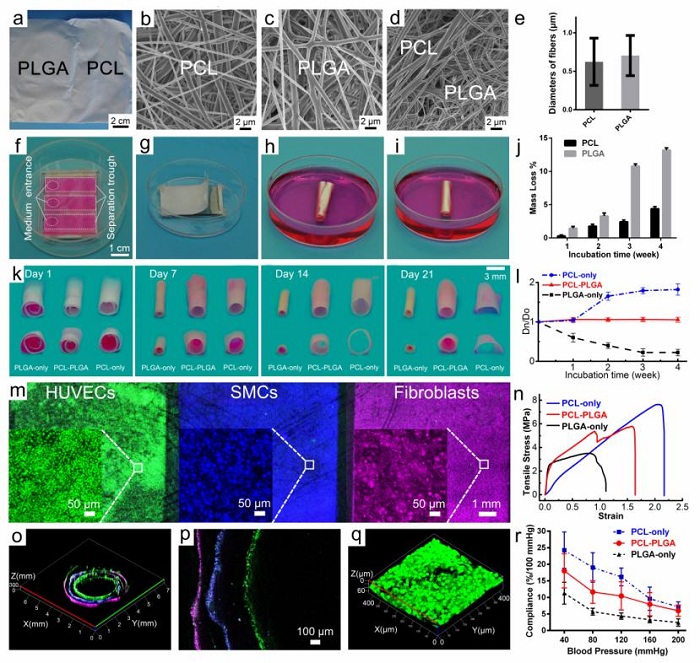 (i) 卷曲后人工血管呈现为类似真实血管的多层结构(内皮细胞-PLGA-平滑肌细胞-PCL-成纤维细胞-PCL);