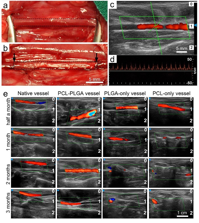 (e) PCL/PLGA/PCL-PLGA血管术后3个月的通畅情况,PCL-PLGA血管在3个月后仍保持通畅,PLGA血管在第二月后表现为堵塞,PCL血管在第一月后表现为堵塞。