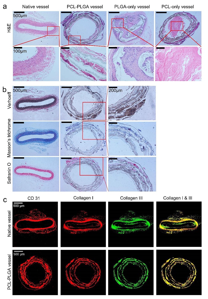 (b) Verhoeff、Masson、Safranin’O染色结果表明,PCL-PLGA血管中有弹性纤维蛋白、胶原蛋白、粘多糖的生成;