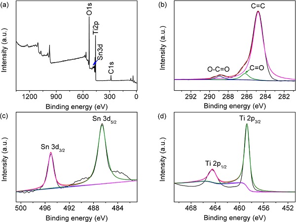 (b-d) 分别是碳、锡、钛元素的精细XPS谱图。