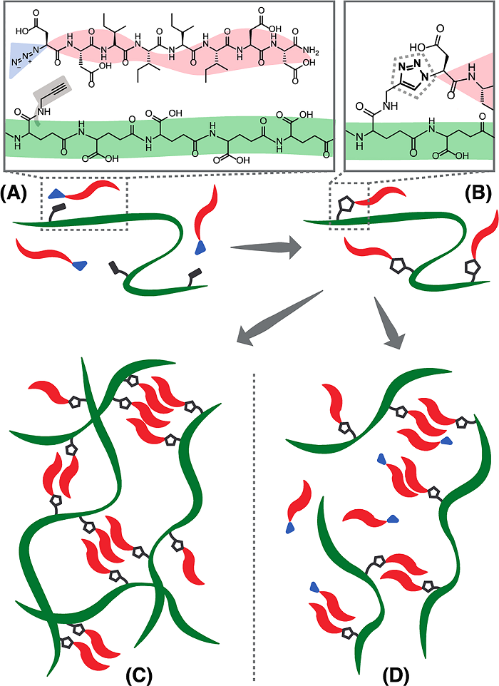 (b) 杂化水凝胶的合成和自组装是将叠氮化的多肽与炔烃功能化的聚合物经铜催化发生化学反应;