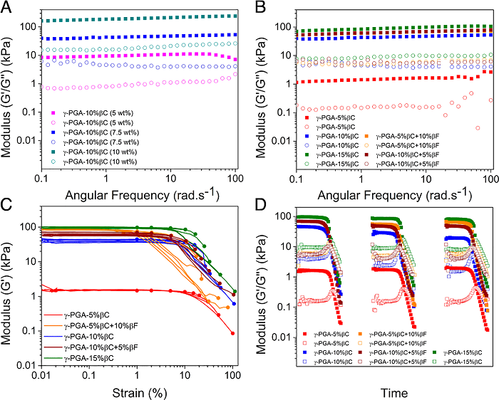 (a) 不同浓度(5,7.5和10 wt%)的γ-PGA-10%βC杂化水凝胶扫频和杨氏模量的关系;