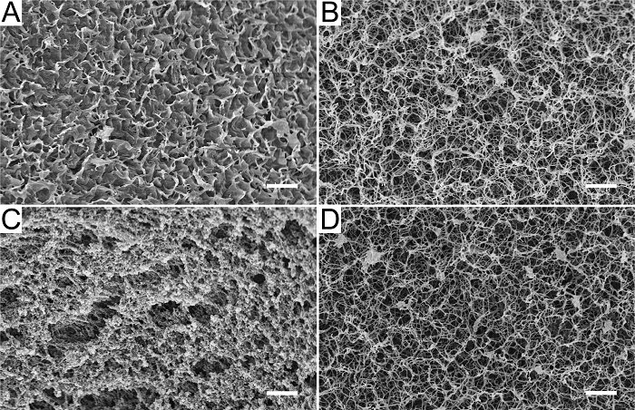 (d) γ-PGA-10%βC+5%βF材料的SEM,所有水凝胶都是由质量分数为7.5%的杂化水凝胶组成,图中的标尺为1 µm。