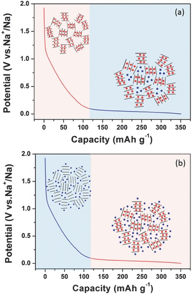 具有资源优势的钠离子电池已成为大规模储能体系的研究热点,而硬碳作为最有希望应用于实用钠离子电池的负极材料受到了广泛的关注。然而,由于硬碳结构复杂,使得目前对于硬碳储钠机理仍存在不同的认识。针对硬碳储钠充放电曲线的两个区域:高电位斜坡区(2-0.1V)和低电位平台区(0.1-0V)。Jahn等首次提出斜坡区容量主要来源于Na+在类石墨层间的脱嵌,而平台区容量则来源于Na+在微孔中的填充或沉积(这里称为“嵌入-吸附”机理)[J. Electrochem. Soc. 2000, 147, 1271](图1a);而Cao 等首次提出斜坡区容量主要来源于Na+在碳表面及边缘缺陷上的吸附,而平台区容量主要体现Na+在类石墨间的嵌脱,类似于Li+在石墨中的嵌脱行为(这里称为“吸附-嵌入”机理)[Nano Lett.2012, 12, 3783](图1b)。由于这两种机理对硬碳储钠行为的理解不同,造成目前对于合成何种结构的硬碳材料具有更高性能仍然不十分明确。因此,进一步理解硬碳储钠机制对发展高性能硬碳材料(高首效和高容量)至关重要。