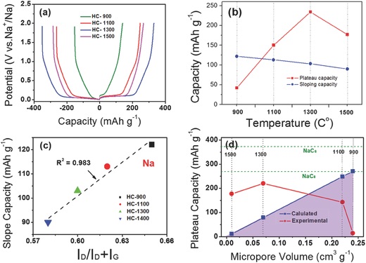 (a)不同热解温度硬碳材料的充放电曲线;(b)平台容量和斜坡容量随热解温度不同的变化趋势图;(c)斜坡容量随ID/ID+IG的变化趋势图;(d)实际平台容量与金属钠填满全部微孔的理论容量比较图。