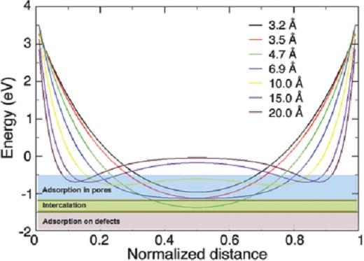 为了进一步验证硬碳储钠的储钠反应机制,作者通过理论计算和现场XRD等测试方法进行了更为深入的探索和研究。作者通过理论计算发现Na+嵌入碳层所对应的能量区非常窄,只有当层间距在0.35-0.47nm范围内才能满足。而过小的碳层间无法嵌钠,过大的碳层间则表现出吸附行为,这与实验观察和Li+嵌入碳材料的结果相一致。以上研究结果,符合“吸附-嵌入”机理。