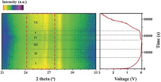 图4.硬碳材料HC-1300在首次充放电过程中的现场XRD测试(200 mA g-1)