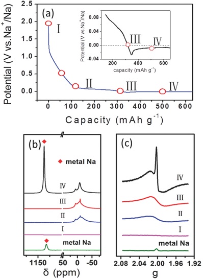 最后,作者还研究了硬碳电极上金属钠析出的电化学行为。图5(a)为硬碳电极过嵌钠的放电曲线。从放大图中可以看出,从0.04V到-0.03V,放电电压急剧下降,之后又回复到-0.01V并稳定下来,这明显是金属钠在碳表面沉积时所展现出的极化和去极化现象。为了进一步监测整个放电过程中钠的存在状态,作者通过固体核磁共振(NMR)和电子自旋共振(EPR)等测试手段对放电到不同电位下的硬碳材料进行了研究。从图5(b)的NMR图谱中可以看出,当电池处于开路状态时(Ⅰ),并未出现检测信号,说明此时在硬碳材料中不存在Na元素,当放电至0V(Ⅲ)时,仍未出现金属钠的信号,但放电至更负(Ⅳ)时,出现了强烈的金属钠的信号,由此说明放电至0V时钠元素的状态并不是以金属态或半金属态存在,而只有当放电到更负的电位下才出现金属钠的沉积。从图5(c)的EPR图谱中可以看出,只有在放电至-0.03V(Ⅳ)时谱图上才出现典型的金属信号。这都说明平台区容量并不是来源于金属钠在微孔中的析出,符合“吸附-嵌入”机理的描述。