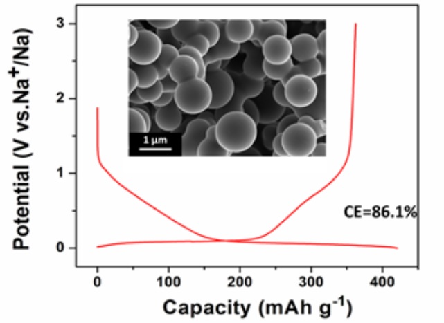 以上实验研究结果都符合“吸附-嵌入”机理,即认为低电位平台容量主要来自于Na+在硬碳层间的嵌入形成NaCx化合物,其类似于Li+在石墨中的嵌入过程,而与微孔体积无关。基于以上机理探讨,并根据“吸附-嵌入”机理对储钠碳材料性能所提出的要求:提高平台区容量需要合适的碳层间距,并不需要大的微孔体积。由此,作者设计并合成了一种极低比表面积(0.17 m2 g-1)和极小微孔体积的硬碳球,其展示了高的首效(86.1%)和高的储钠可逆容量(362 mAh/g)(图6)。这一机理的明确为指导开发和设计具有高性能的实用性硬碳储钠负极材料提供理论基础。